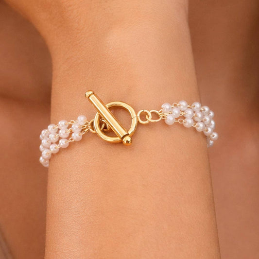 "Wonder" Soft Creams and Blues with Pearls and Gold Hair Tie Bracelets: Medium
