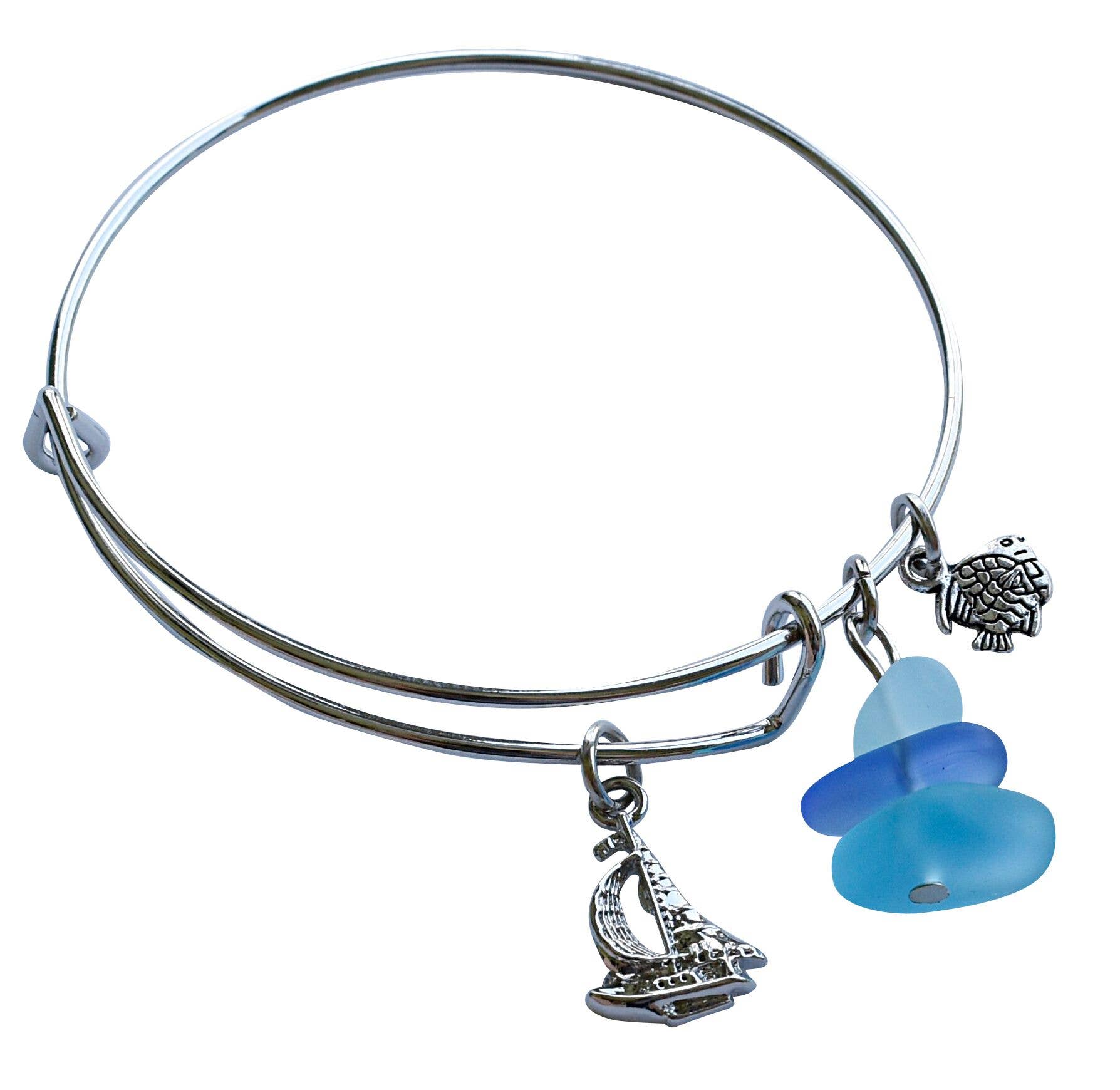 Adjustable Sailboat charm bangle with our signature Hoodoo beach glass dangle. Made in America. Nickle free, lead free.