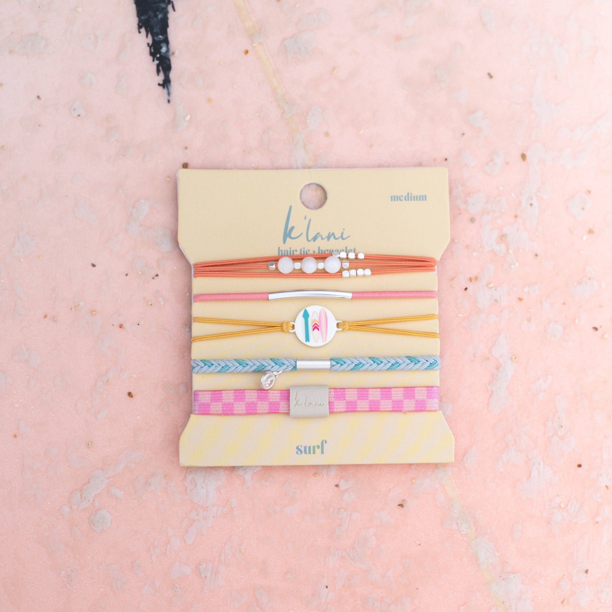The Surf set captures the carefree energy of endless summer days. These 5 hair tie bracelets feature vibrant, sun-soaked colors paired with silver beads and playful charms, including a colorful surfboard accent. Fun, bold, and beach-ready, this set is perfect for riding the waves, chasing sunshine, and bringing laid-back surf style wherever you go.